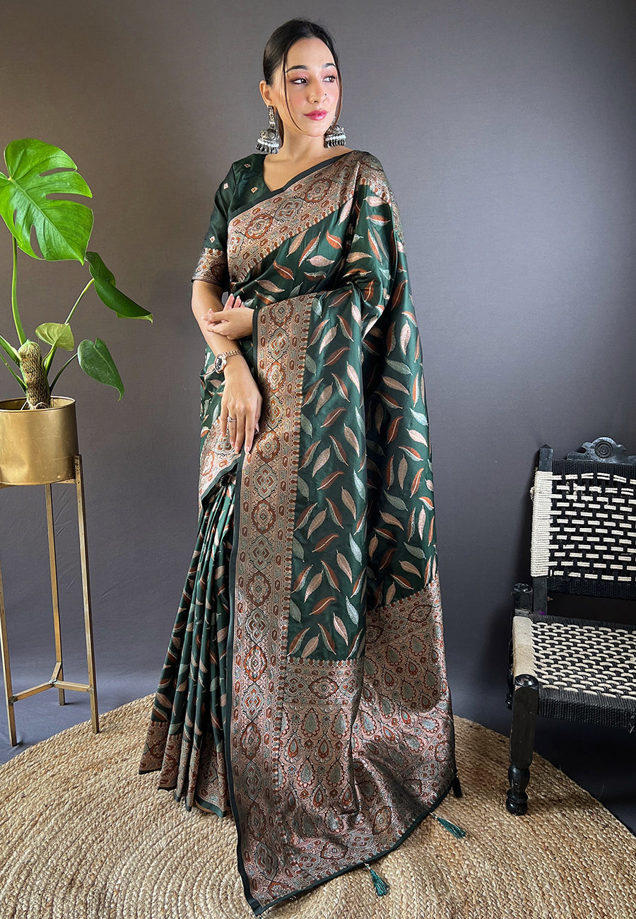 Sari tissé en soie douce verte Zari