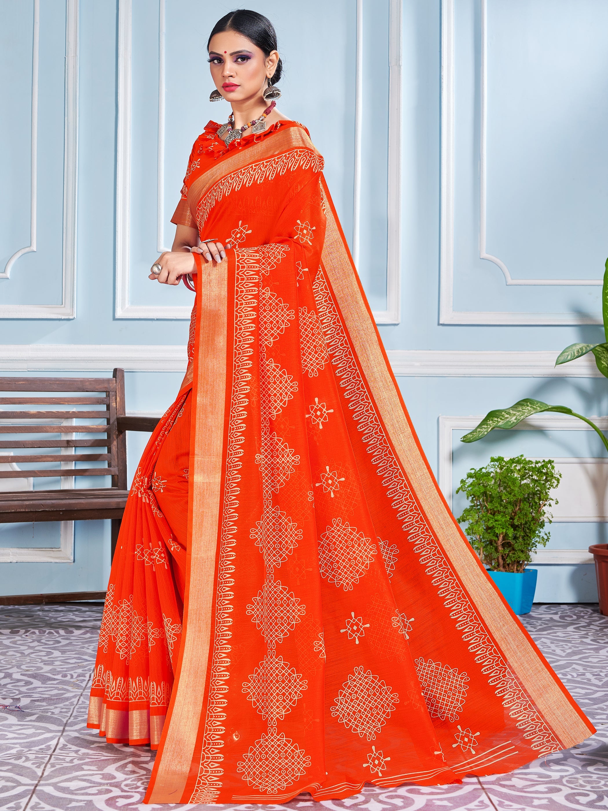 Orange Cotton Silk Printed Saree