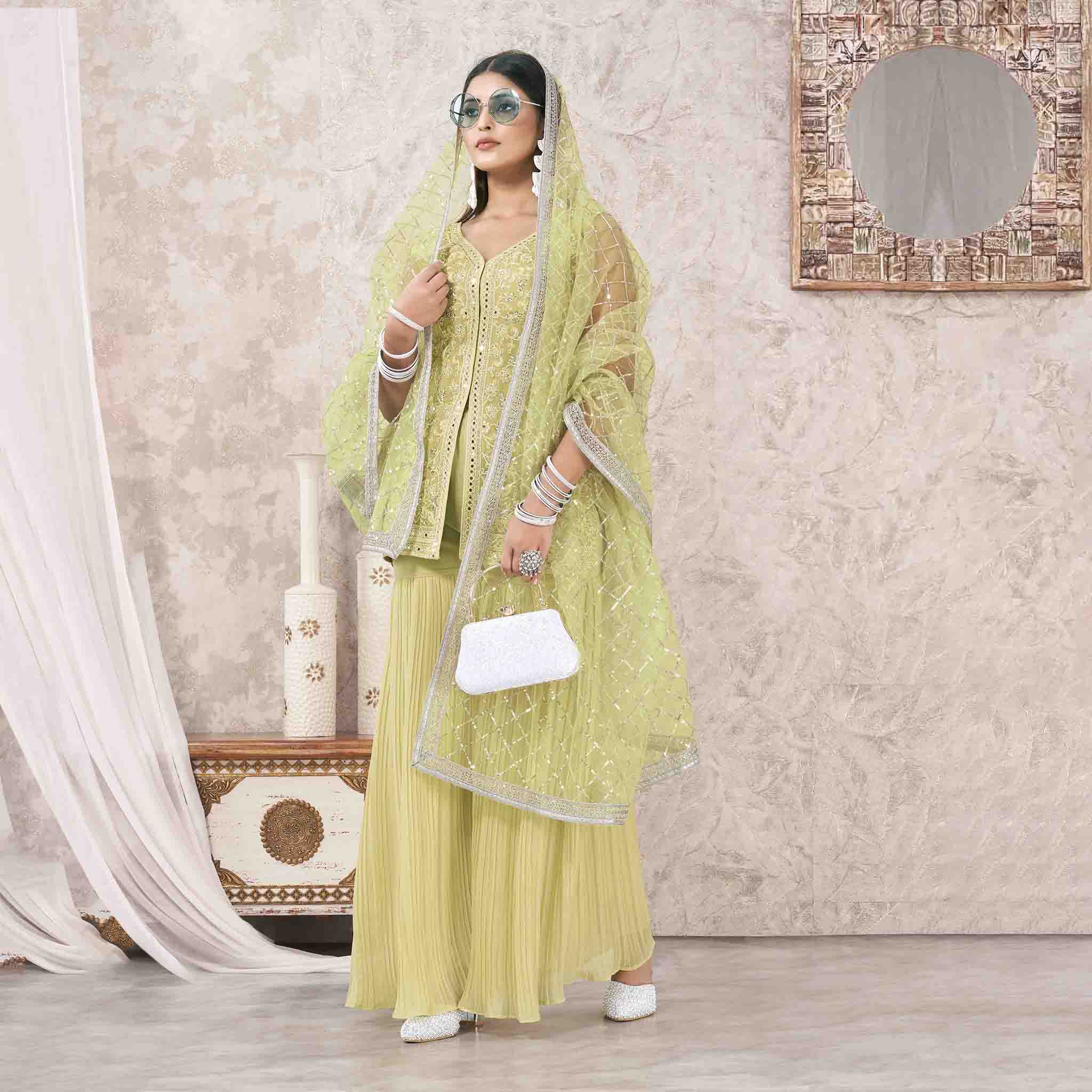 Pista Georgette Embroidered Sharara Suit With Bottom and Dupatta