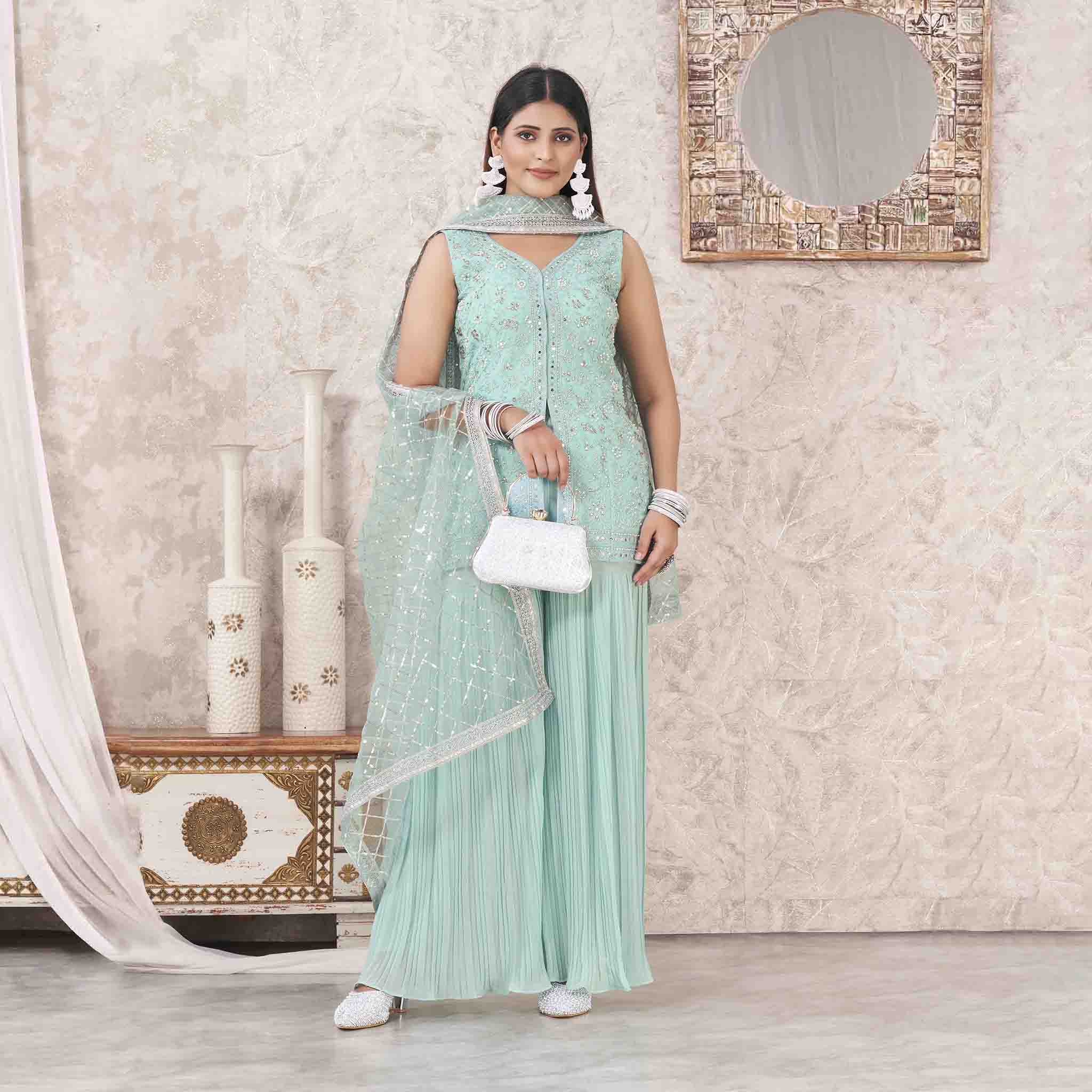 Teal Georgette Embroidered Sharara Suit With Bottom and Dupatta