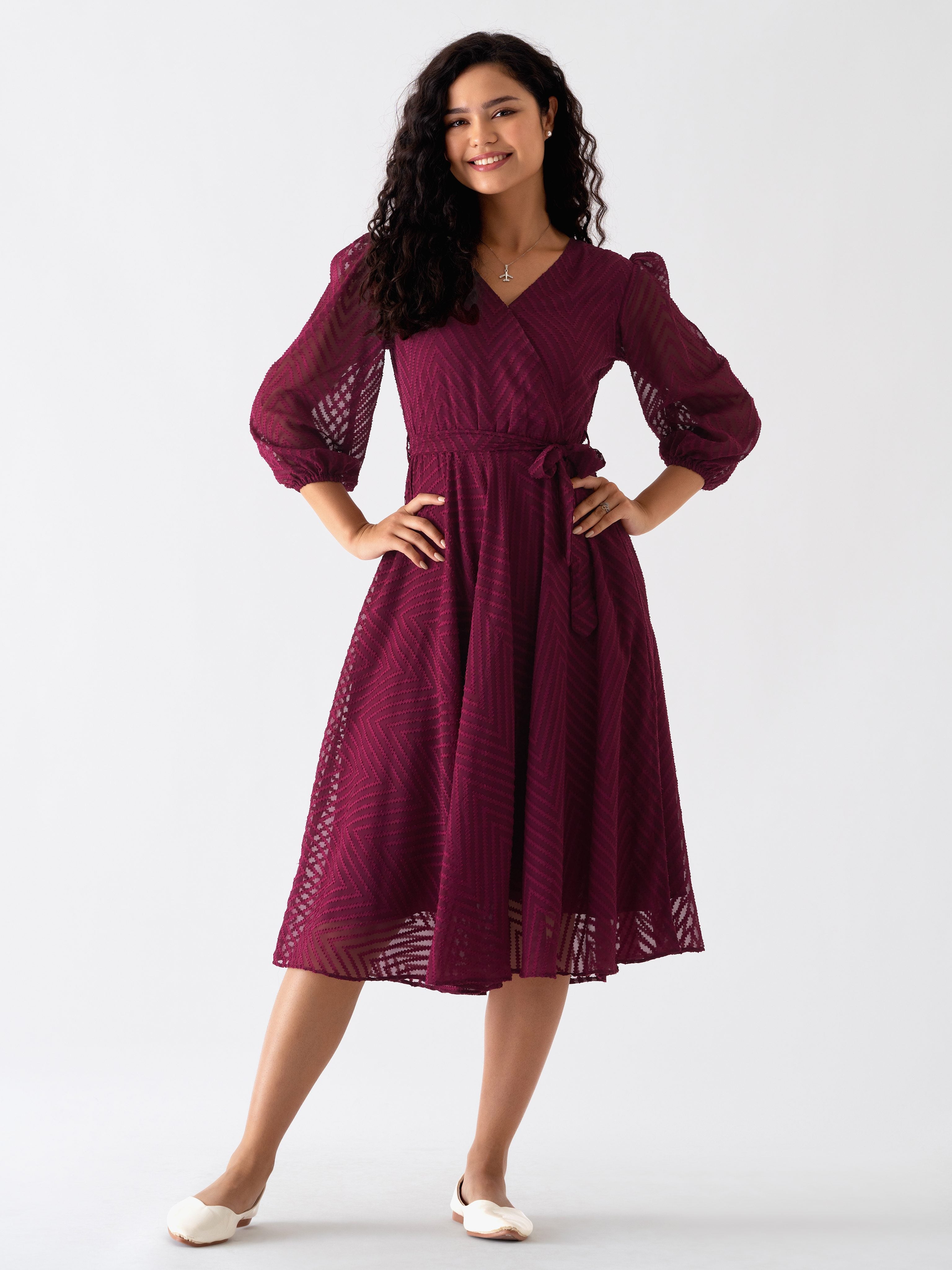 Wine Berry Chiffon Brasso Swiss Dot V-Neck Dress