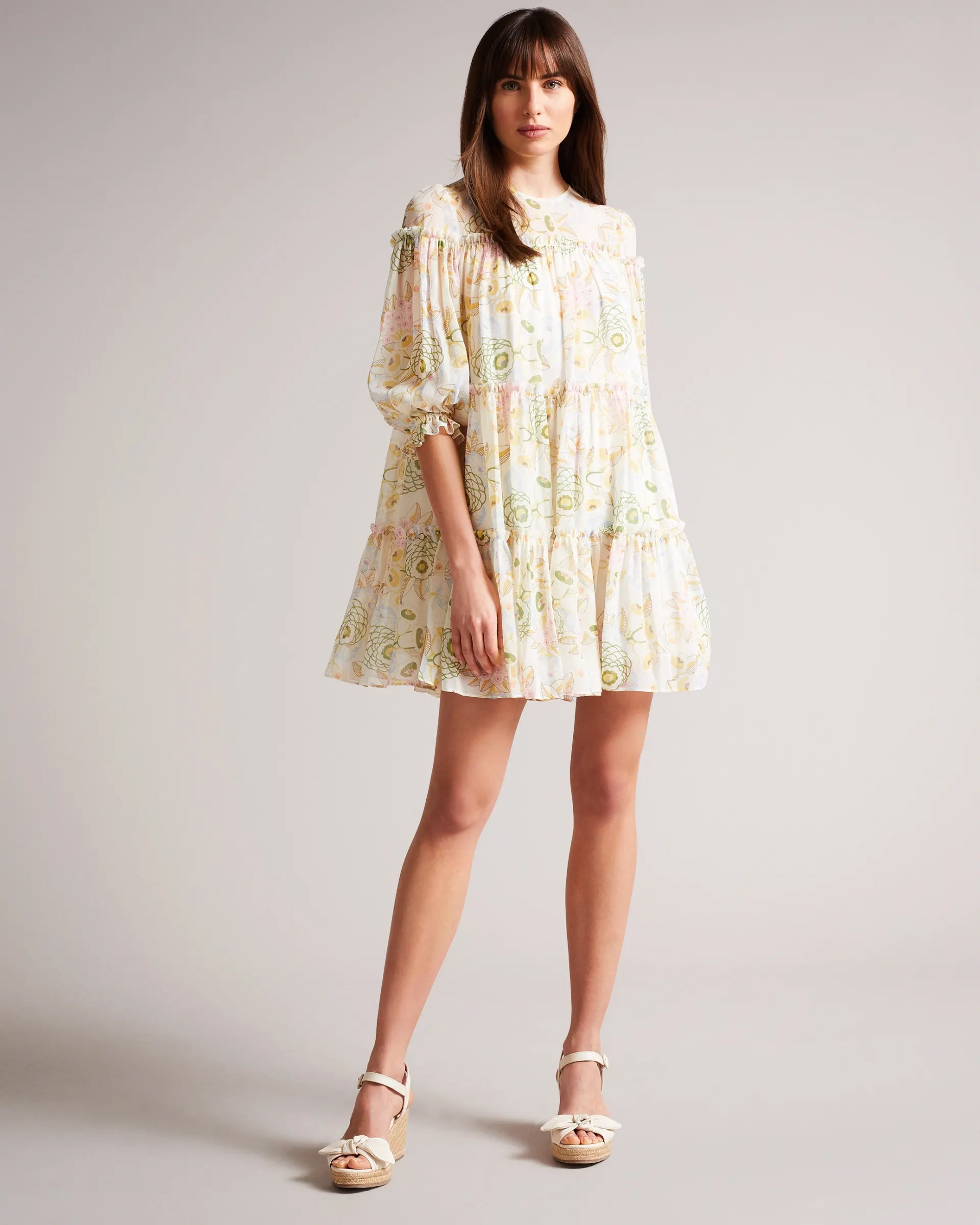 Georgette Long Sleeve Balloon Mock Neck Printed Short Casual Dress